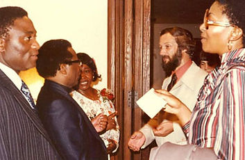 Bishop Muzorewa (center glasses), Head of the United African National Council of Zimbabwe greeting guests in Salisbury (now Harare) 1977.